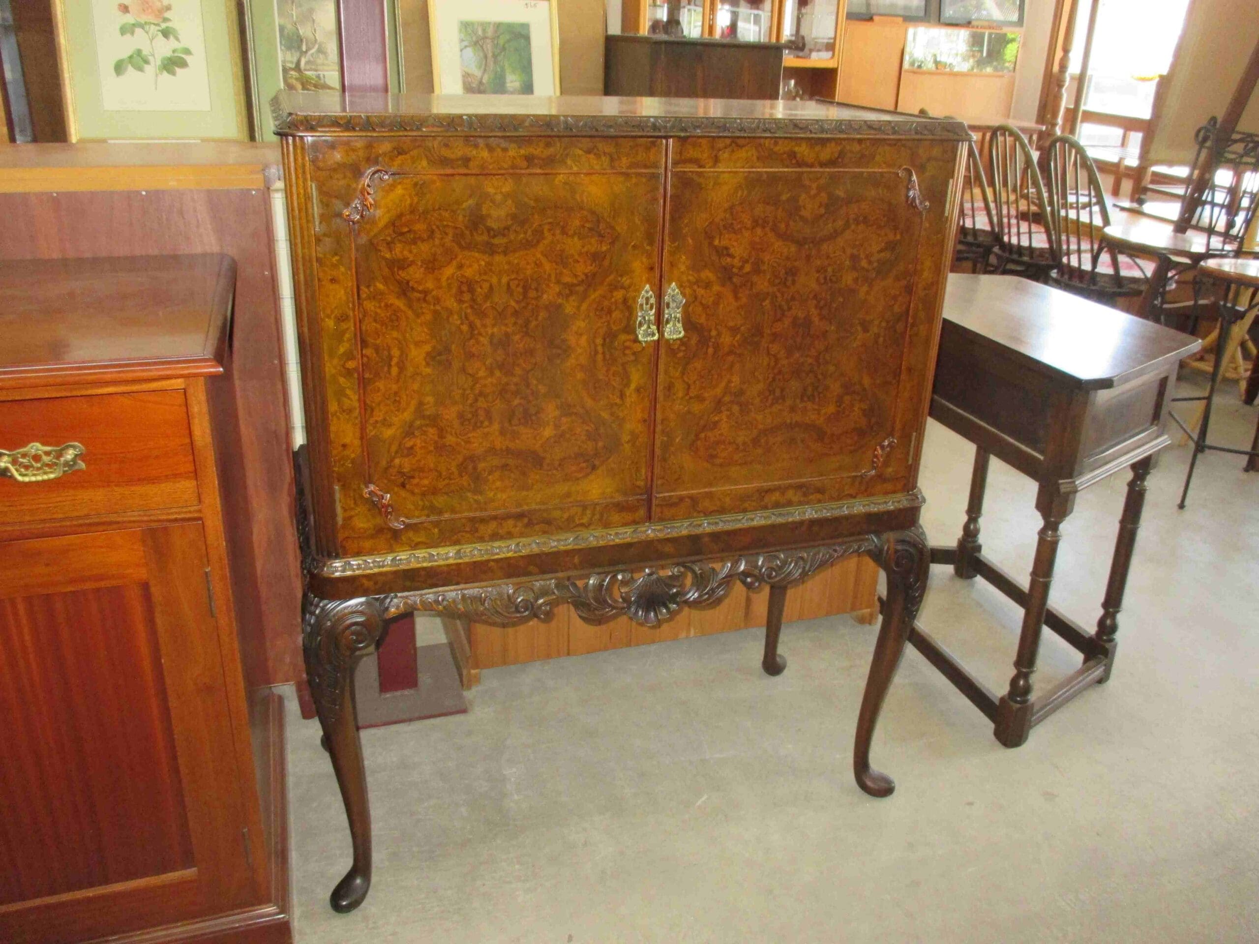 Carved Frame , Burr Walnut Cocktail Cabinet , circa 1950 , size 960 x 470 x 1160 high